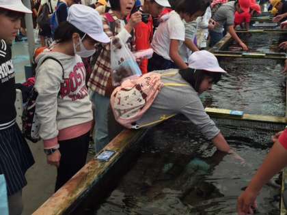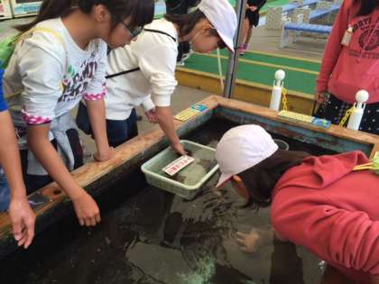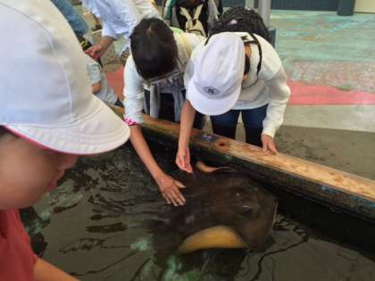 海の生き物に直接触れることができるコーナーでは、腕まくりをしてしっかりと触っていました。
