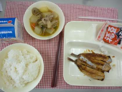 2月2日の給食は「いわしのしょうがじょうゆかけ」「含め煮」「いり大豆」です。もうおわかりのように、節分の行事献立です。