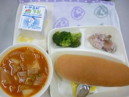 2月5日の給食は「鶏肉のバジル焼き」「ウインナーと野菜のケチャップ煮」「ブロッコリーのサラダ」です。ケチャップの味が具をよく引き立てていました。