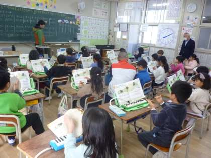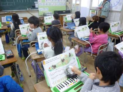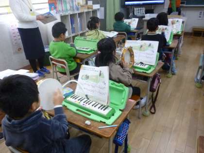 まず、「卒業を祝う会」で歌う「ひまわりの約束」を合唱し、今まで習った歌も歌いました。それから「子犬のマーチ」の合奏に取り組みました。鍵盤ハーモニカをはじめ、タンバリンやトライアングルなどの打楽器も交代で演奏していきました。