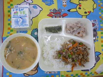2月6日の給食は「鶏ごぼうご飯」「みそ汁」「焼きれんこん」です。鶏ごぼうご飯は、具と御飯がよく合っており、とても好評でした。