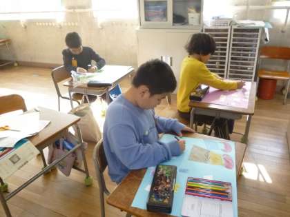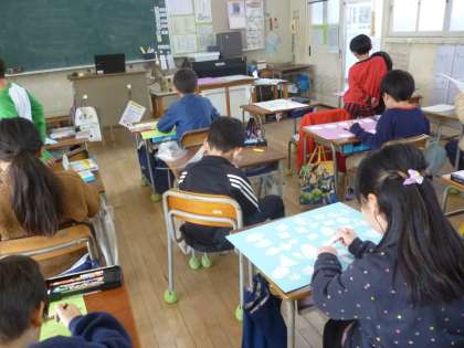 2年生は今までの生活の思い出をすごろくにする学習をしています。「サッカーの大会で優勝した。3マス進む」「九九をおぼえた。1マス進む」など、思い出をマスにしていました。