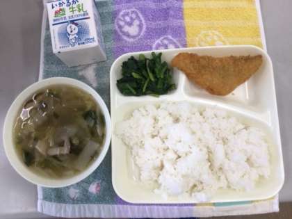 2月7日の給食は、たらのフライ、うすくず汁、ほうれんそうのおひたしです。たらのフライは白身で外はカリッと中はふわっと揚がっていました。ほうれん草も子どもたちはたくさん食べていました。