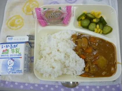 2月9日の給食は「チキンレバーカレーライス」「きゅうりとコーンのサラダ」「スイートポテト」です。スイートポテトはアレルゲンなしの優しいメニューです。