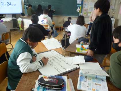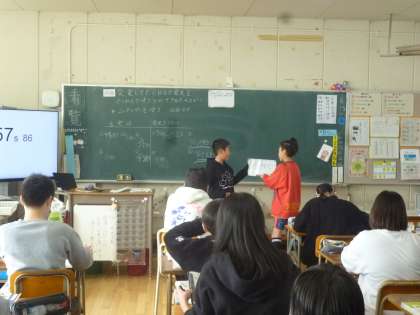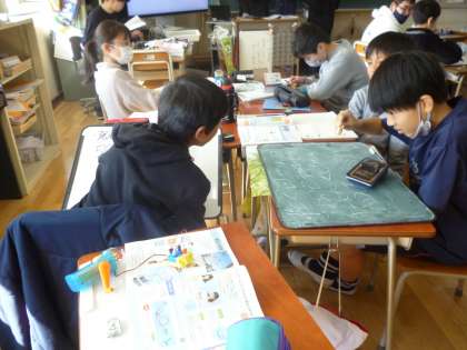 6年生は手回し発電機を使った実験を続けています。コンデンサーに電気を貯めてどのくらいの時間、電球や発光ダイオードが付くか調べていき、結果を発表し合いました。