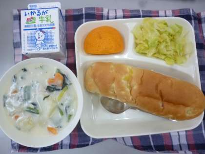 2月14日の給食は「ほうれん草のクリームシチュー」「キャベツのサラダ」でデザートに「デコポン」が出ました。シチューはしっかりした味付けでおいしくいただけました。