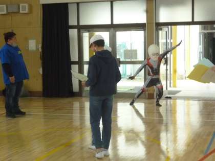 9名の方々が来校してくださいました。メンバー紹介の時に「戦隊ヒーロー」が登場し、子どもたちをワクワクさせてくださいました。新しく完成した講堂で2つのチームのに分かれて、スポーツをしました。はじめはドッジボールです。