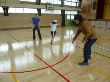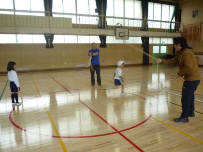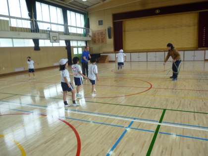 1年生は長縄跳びを初めてしました。いきなり跳ぶことはむずかしいので、動く長縄を通り向けたりしてタイミングを練習していきました。慣れてくると回転した長縄を跳ぶことにチャレンジします。