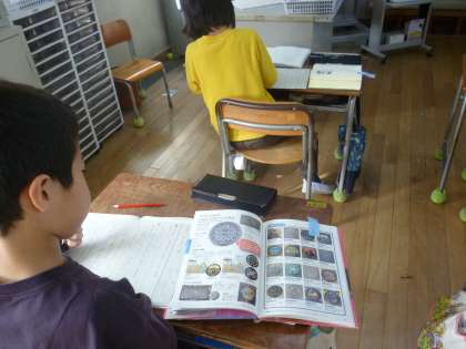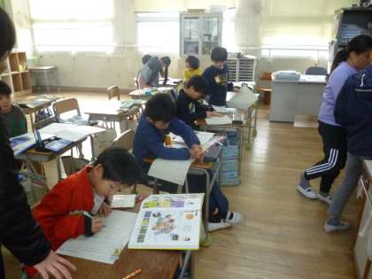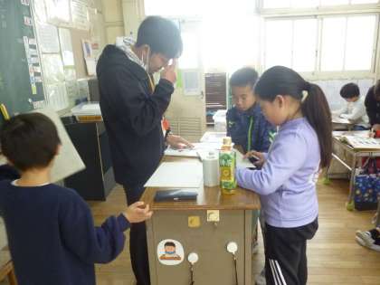 2年生は国語で身の回りの「穴」について調べています。栓抜きの穴やスマートフォンの株の穴など、身の回りにある「穴」を見つけ、その役割について調べていきました。穴の役割はむずかしいので、担任にヒントを聞きに行っていました。