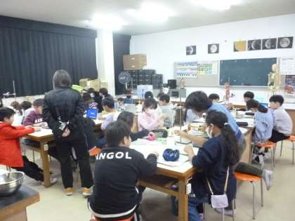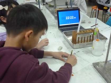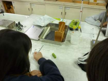 4年生は理科で水を冷やしていく実験をしました。水を入れた試験管を水と食塩を入れた水槽に入れます。試験管の水が凍り、体積が増えること、その時の温度を確認していきました。