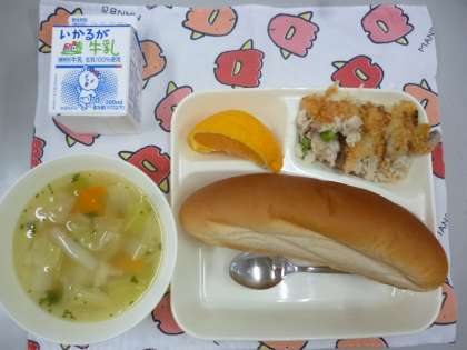 2月21日の給食は「押し麦のグラタン」「豚肉と野菜のスープ」でEdyデコポンが出ました。グラタンはどの種類でも人気があります。