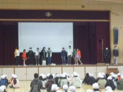 今日は児童委員会の発表がありました。今日は「運動・集会委員会」と「代表委員会」の発表です。「運動・集会委員会」はクイズ形式で、「代表委員会」は「廊下を走らない」をテーマにした寸劇をしました。みんな集会を楽しんでいました。