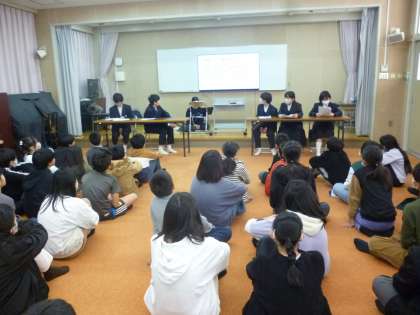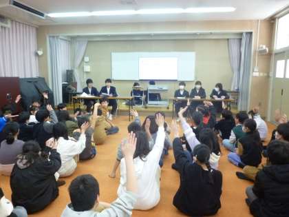 6年生は卒業が近づいてきました。あと1か月少しで中学生になります。今日は南港北中学校の生徒会のメンバーが来校し、6年生に中学校生活の説明をしてくれました。動画による各教室や施設の紹介から始まりました。続いて生徒会から中学校生活について詳しい話がありました。小学校生活との違いや入学まですべきことを経験を踏まえて説明してもらいました。6年生は質問をするなど中学校生活に期待を寄せていることがよくわかりました。生徒会の皆さんとご指導いただきました先生方、ありがとうございました。