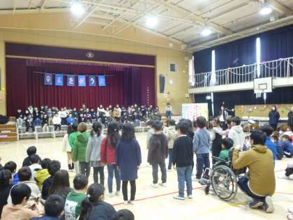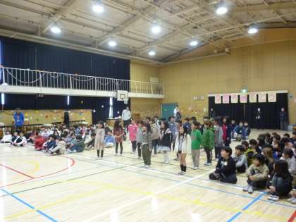 次は学年ごとの発表です。まず1年生です。元気よく歌い、6年生への応援の掛け声が素晴らしかったです。