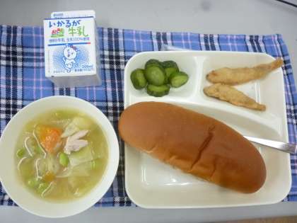 2月最終の給食は「洋風煮」「わかさぎフライ」「きゅうりのピクルス」です。洋風煮は具だくさんでおいしくいただけました。