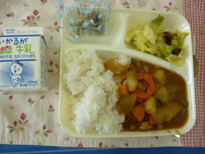 3月最初の給食は「チキンカレーライス」「ビーンズサラダ」「ミニフィッシュ」です。大人気のカレーライスにみんな大喜びでした。