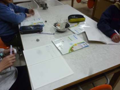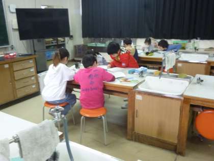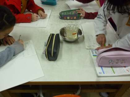 4年生は水の実験をしています。今日はビーカー入れた水を氷で冷やし、ラップで蓋をしました。しばらく時間を置き、水滴のつく様子を観察してノートに記録していきました。