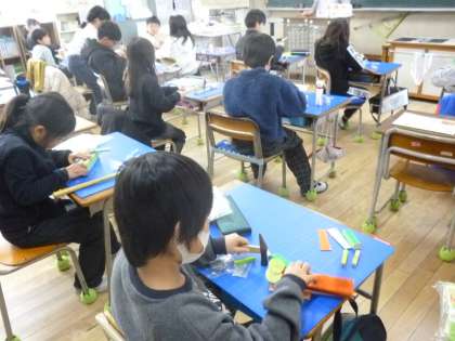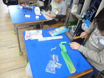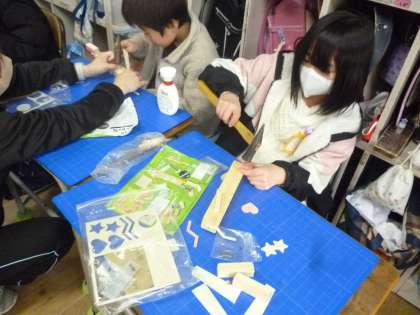 3年生は工作で木工作品を作っています。釘でパーツを固定して仕上げます。釘が曲がらないように慎重に打っていました。