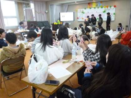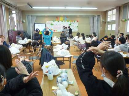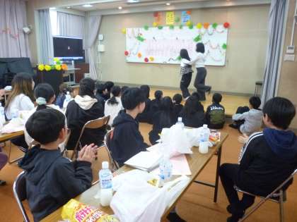 6年生は茶話会をしました。グループごとに出し物をしたりしてとても楽しい会でした。PTAの方々が準備していただいたお菓子やジュースを味わいながら、グループの発表を見ていました。カラオケや手品、ダンス、クイズなどとても楽しい内容でした。