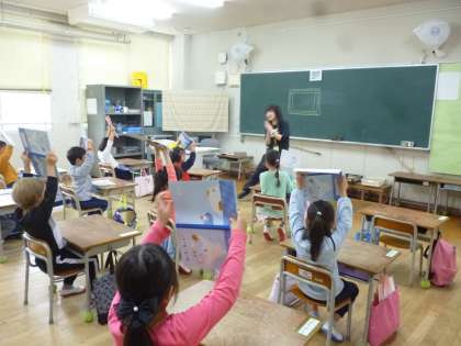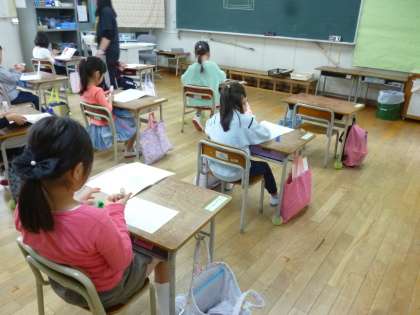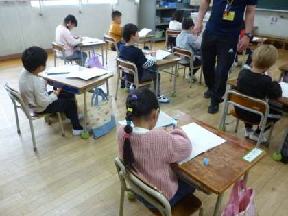 1年生は教室でトイレの使い方やお話の聞き方など学校生活の基本を教えてもらいました。糊で連絡プリントを連絡帳に丁寧に貼っていました。その連絡帳を担任に見せるなど、入学した喜びでいっぱいでした。