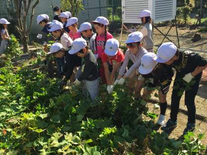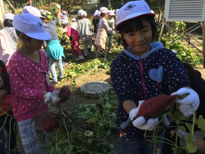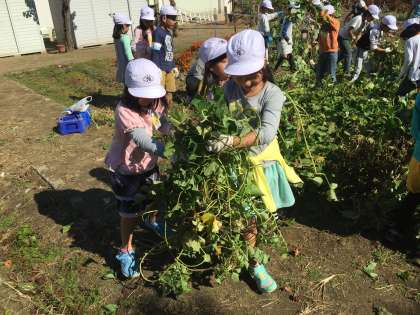2年生は、春から育ててきたさつまいもを収穫しました。長く伸びたツルをひっぱり、畑からいもを掘り出しました。