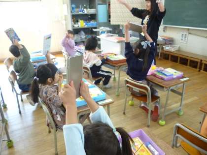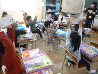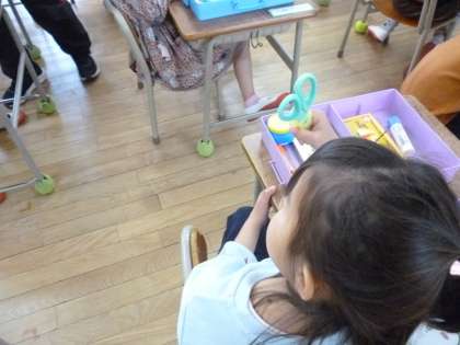 1年生はお道具箱の中を確認しました。一つ一つの道具を出し、担任に見せていました。また、はさみの安全な使い方も教えてもらいました。