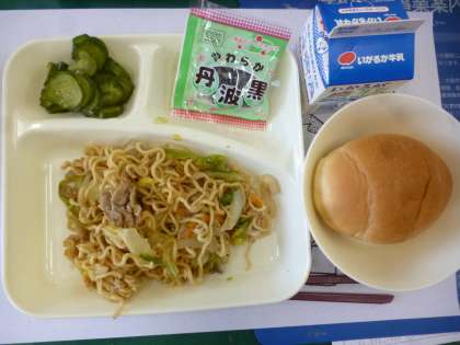 4月10日の給食は「焼きそば」「きゅうりのしょうがづけ」「ソフト黒豆」です。焼きそばや大人気の献立で1年生も喜んで食べていました。