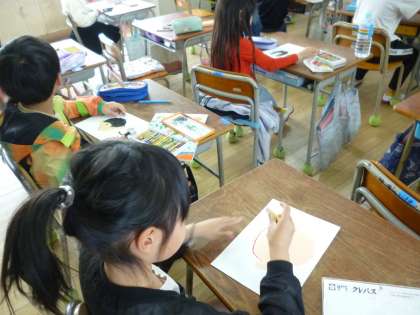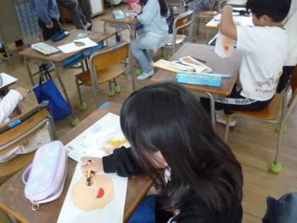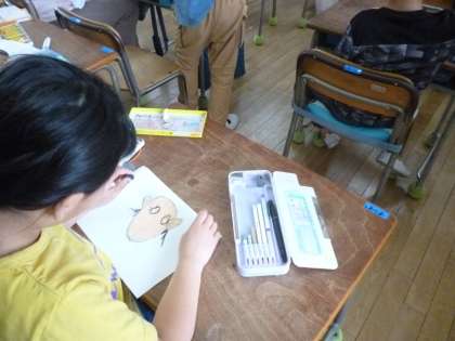 2年生は自分の顔を描きました。学級目標を決め、その目標の周りに貼って、教室の後ろに掲示します。参観の日にご覧いただけます。