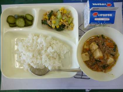 4月12日の給食は「マーボー豆腐」「きゅうりの中華和え」「ソフト黒豆」です。マーボー豆腐は子どもたちが食べやすいように辛さを抑えていました。
