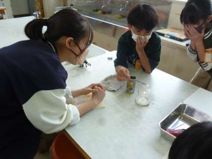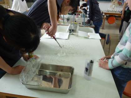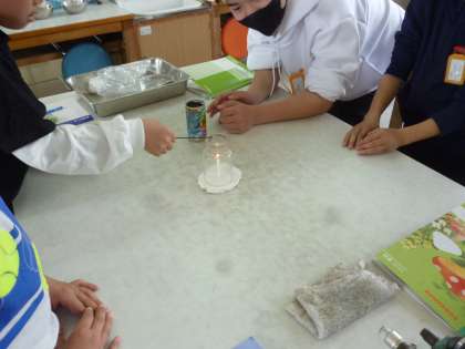 6年生は理科で燃焼の実験をしました。ビンの中のろうそくに上から線香を近づけると煙がどのように動くか確かめました。線香の煙の動きをしっかり見てノートにかいていきました。