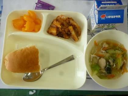 4月15日の給食は「じゃがいものミートグラタン」「レタスのスープ」でデザートに缶詰のみかんがでました。グラタンはどの種類でも人気のある献立です。