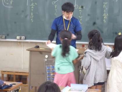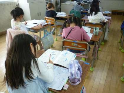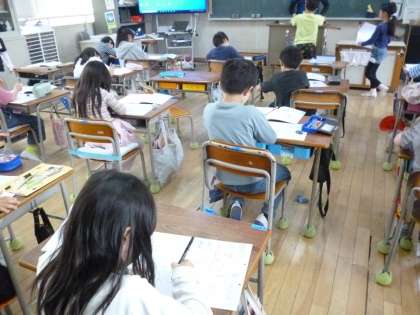 2年生は書き方の学習をしました。サインペンでひらがなとカタカナをていねいに書いていました。