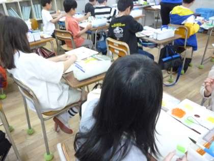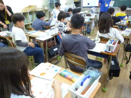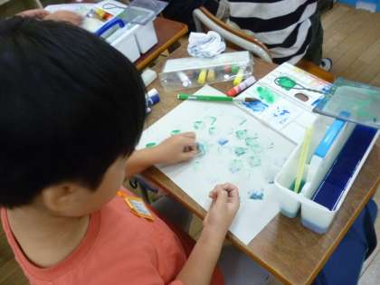 4年生は絵の具の使い方を試しました。スパックリングやスポンジなど、試しながら描いていきました。