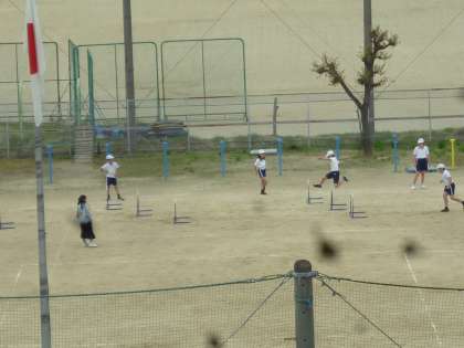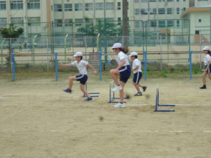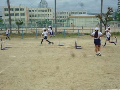 5年生はハードル走の練習をしています。写真のようにハードル間に違いを作り、自分の歩幅に合ったコースを選んで跳んでいきました。