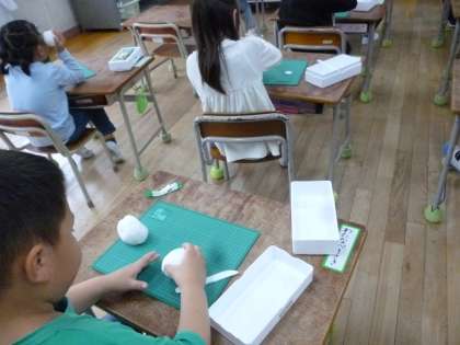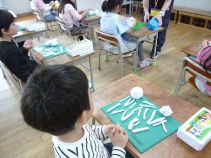 1年生は初めて粘土を使いました。まるめたりひもを作ったりしました。粘土板の使い方、粘土のなおし方など基本を教えてもらいました。粘土を使った後はきれいに手を洗いました。