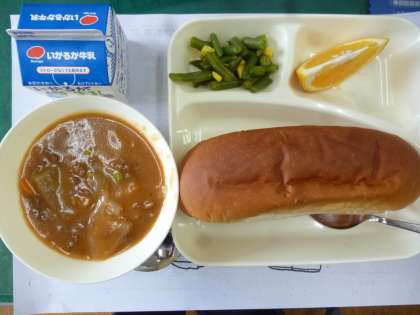 4月24日の給食は「ビーフシチュー」「三度豆とコーンのサラダ」でデザートにあまなつかん」がでました。ビーフシチューは人気献立の一つです。
