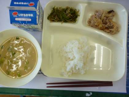4月25日の給食は「豚肉のしょうが焼き」「豆腐のみそ汁」「じゃこピーマン」です。豚肉のしょうが焼きはしょうが風味が肉の味によく合っていました。