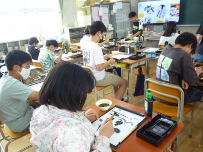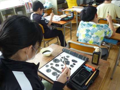 6年生は図工で墨を使って線や模様を描きました。水をうまく使って濃淡を強調して描いていきました。
