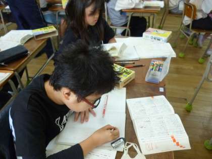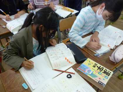 4年生は漢字の学習で漢字辞典を」使っています。辞典の使い方を教えてもらい、漢字を詳しく調べていきました。