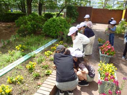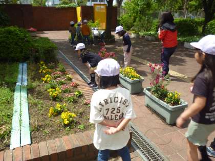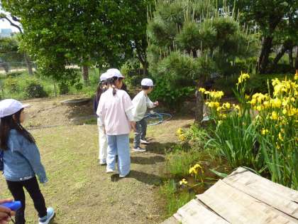 1年生は学習園で春の生き物をさがしました。ちょうどトンボが飛んできて歓声を上げていました。