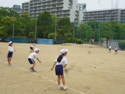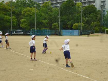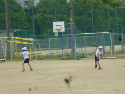 2年生はボール投げの練習を始めました。担任から遠くに投げるこつを教えてもらい、二人組で練習をしていきました。