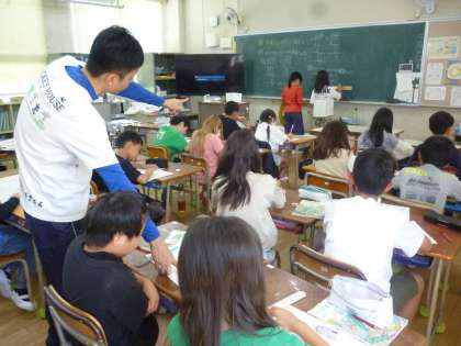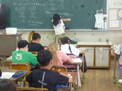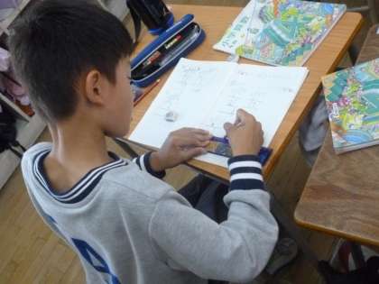 4年生は3桁÷1桁のわり算の学習をしています。余りがあるので間違いやすい計算です。ものさしを使ってていねいに線を引いて筆算をしていました。担任も子どもたちの机の間をまわってアドバイスをしていきました。