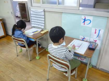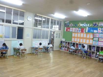 1年生は初めてテストをしました。テストの目的や注意点を聞き、算数の問題に取り組みました。