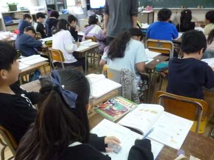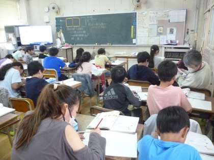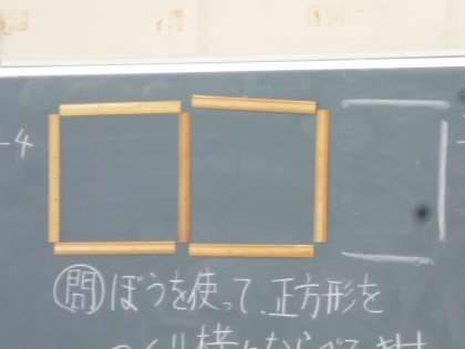 5年生は写真のように棒でできた正方形をつなげていき、「5つの正方形なら棒は何本か?」という問題を考えました。むずかしい問題ですが、1個なら何本、2本なら何本と表にして考えていきました。法則性に気づいた子は正解していました。