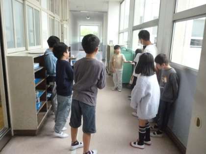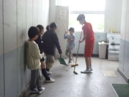 今日からたて割り清掃が始まりました。毎週月曜日から木曜日までたて割り班で清掃します。上級生が優しく教え、終了後はがんばったことを話し合って拍手をし合いました。