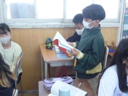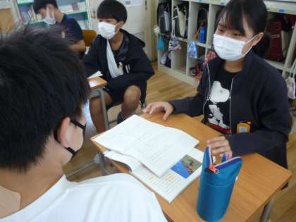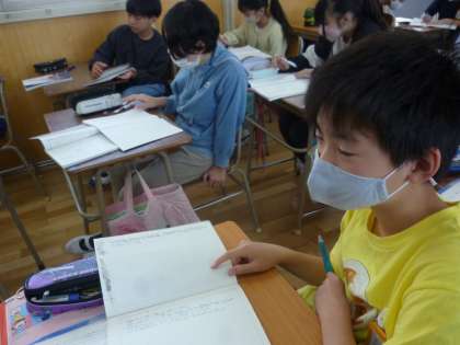 6年生は国語で「イースター島にはなぜ森林がないか」を読んで学習しています。今日は作者の論の進め方について考え、意見交流しました。