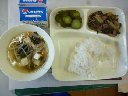 5月14日の給食は「プルコギ」「豆腐とわかめのスープ」きゅうりの甘酢づけ」です。プルコギは韓国・朝鮮の料理です。プルは「火」コギは「肉」という意味で合わせて「火で焼いた肉」という意味です。肉が柔らかくとてもおいしくいただけました。