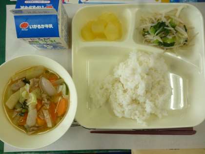 5月15日の給食は「中華煮」「チンゲンサイともやしのしょうがあえ」でデザートに缶詰のリンゴが出ました。中華煮はしっかりと味がついていておいしくいただけました。