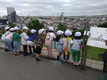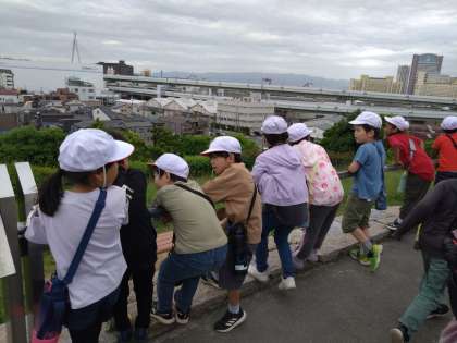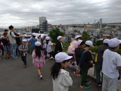 丘乗り越える頂上から景色を楽しみます。観覧車や有名なテーマパークのジェットコースターも見えて歓声を上げていました。。