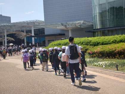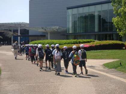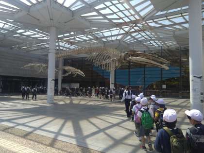 3年生と4年生は遠足で長居公園に行きました。まず自然史博物館に着きました。本物の鯨の骨格が迎えてくれました。